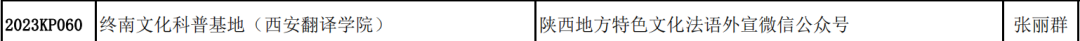 今日,陕西省社会科学界联合会公布了“2023年度陕西省社科普及资助项目”立项名单,全省共立项60项。其中,我院张丽群老师主持的项目《陕西地方特色文化法语外宣微信公众号》(项目编号:2023KP060)获批立项。