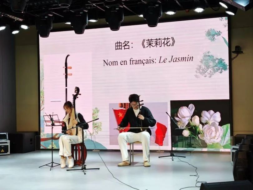 随后,中国乐器表演以古筝《雪山春晓》的悠扬旋律开场,琵琶《十面埋伏》的气势磅礴紧随其后,二胡与琵琶合奏的《茉莉花》更是令人陶醉,让法国学生深刻感受到了中国传统乐器的独特魅力。法语系学生焦颖馨演唱的《青花瓷》旋律优美,如同一幅动人的画卷;法国学生则通过中国舞、城市介绍和合唱《森林里的一棵树》展现了他们对中国文化的热爱。法语系学生周锦荣演唱的法语歌曲《si on disait》展现了我系学生对法语歌曲的热爱;刘宸赫领唱的《Les Champs-Elysées》将活动氛围推向高潮。