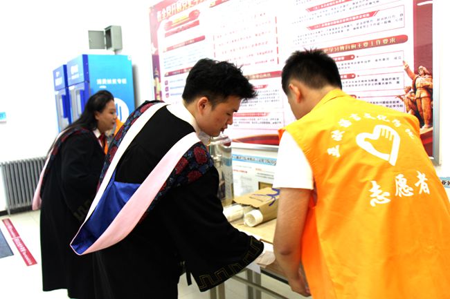 志愿者们身穿整齐的橘色志愿服,热情洋溢、积极主动地为毕业生进行手续办理指引,并专门设置了毕业生打印窗口,为他们打印资料提供便利。期间,志愿者们设立了服务站点,安排轮流值班,保证每个服务站点人员充足、办事高效,及时解决毕业生离校中的问题及困难。志愿者们用自己的行动、微笑、汗水,诠释着学院师生对毕业生的关爱和眷恋。与此同时,学院还提供酸梅汤、开水、橙汁等饮品,在这炎热的夏季,为毕业生们送去一丝清凉。