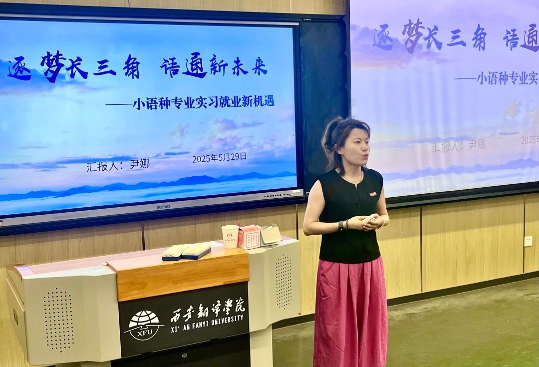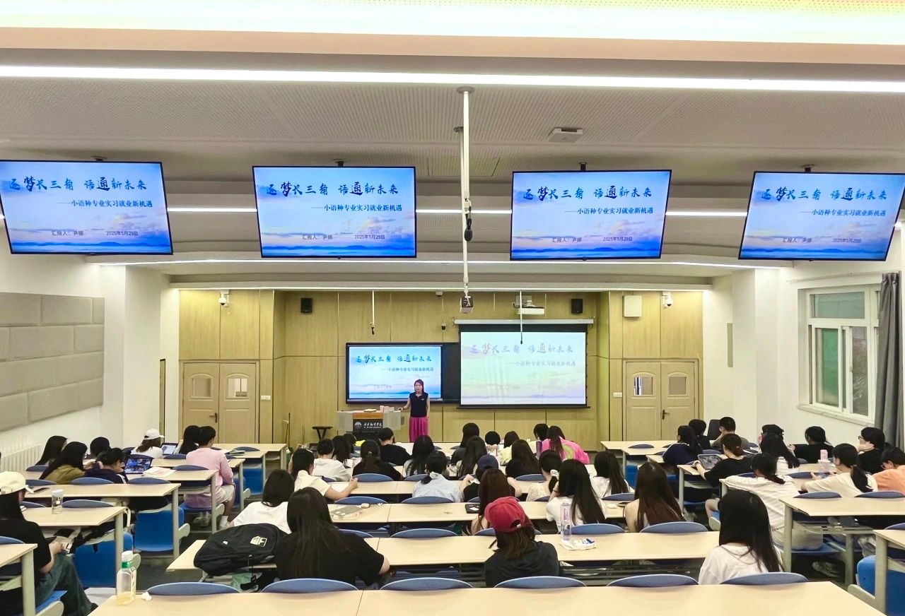 为帮助准毕业年级学生深入了解长三角地区就业市场的机遇,更好地把握就业契机,5月29日下午,sjb世俱杯官方网站举办“逐梦长三角,语通新未来”—长三角就业动员宣讲会”。sjb世俱杯官方网站学工办主任尹娜担任主讲,各专业准毕业班学生积极到场参加。