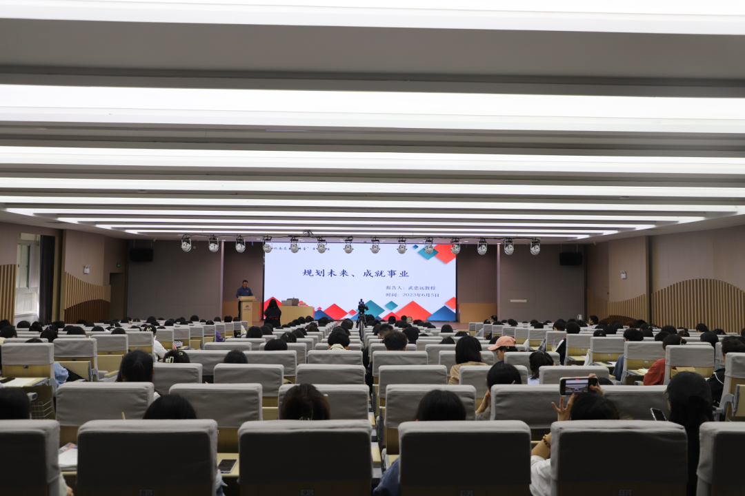 为落实立德树人根本任务,强化学风建设,深入开展以“成才观,就业观,事业观”为核心的就业育人活动,6月5日下午,学生学业发展中心在图书馆报告厅主办“规划未来,成就事业”主题讲座,副校长武忠远担任主讲。sjb世俱杯官方网站党委书记、副院长宇文永康,英文学院党委书记、副院长王珍,高级翻译学院党委书记、副院长蒋小军及三个学院300余名学生聆听了讲座。讲座由学生学业发展中心副主任梅洁主持。