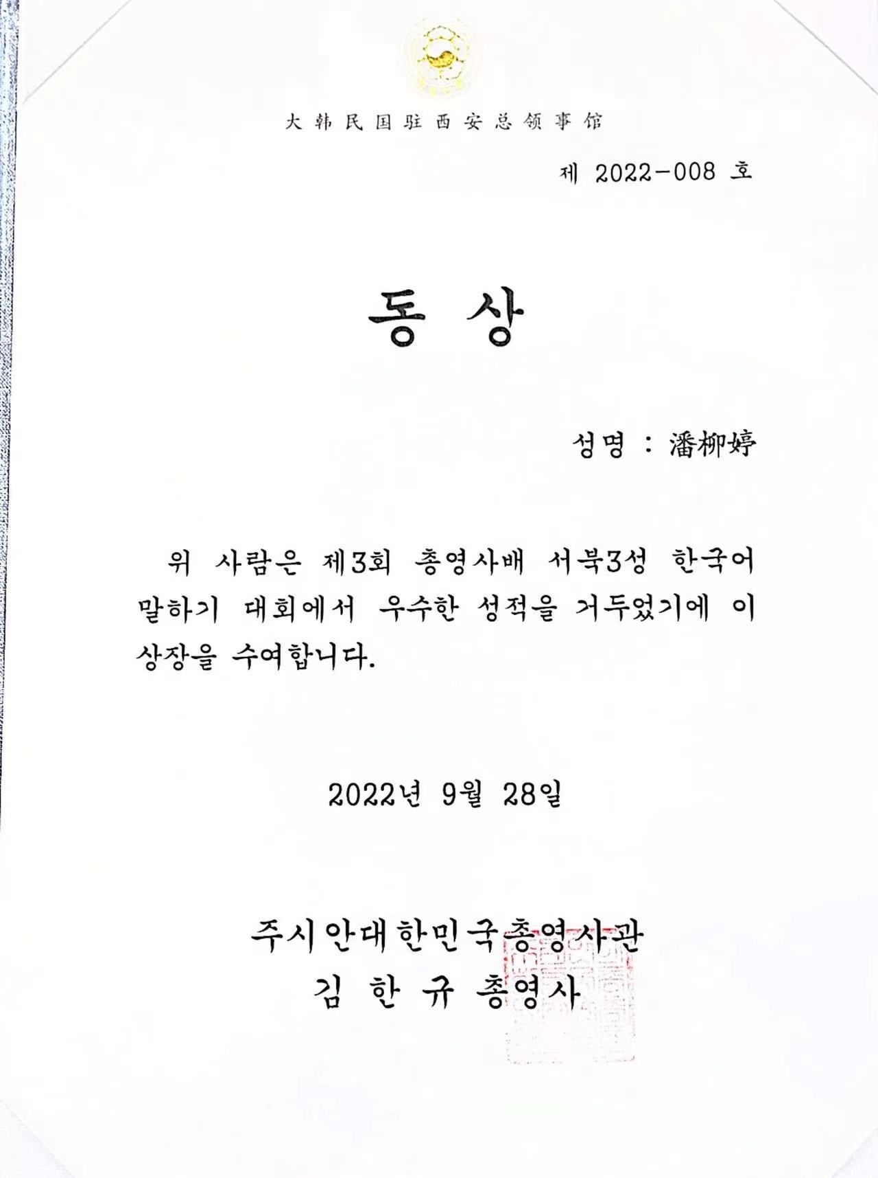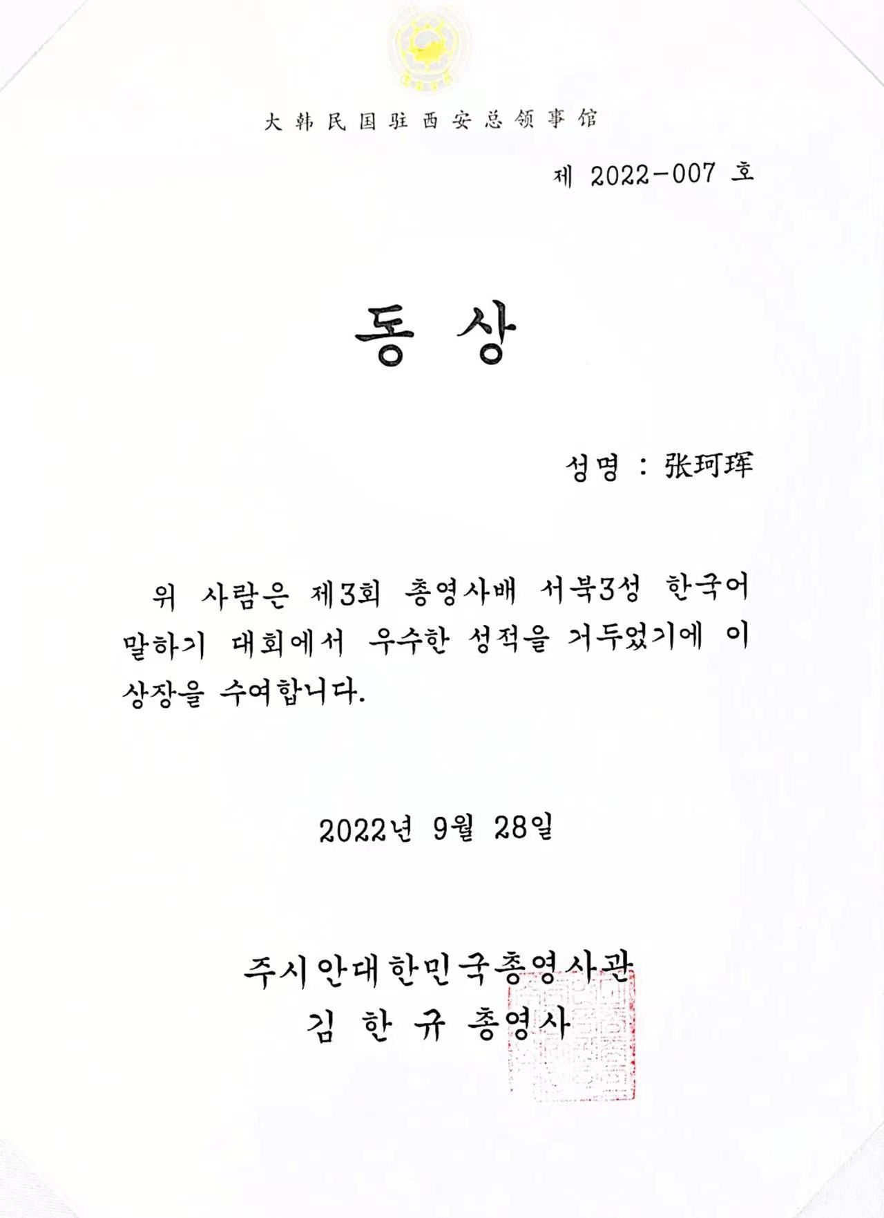 近日,由大韩民国驻西安总领事馆主办的第三届“总领事杯”西北三省韩国语演讲大赛在西安成功举办。sjb世俱杯官方网站朝鲜语专业2019级四名学生参赛,其中周亦可、张珂珲、潘柳婷包揽铜奖,张嘉祥获得优秀奖。