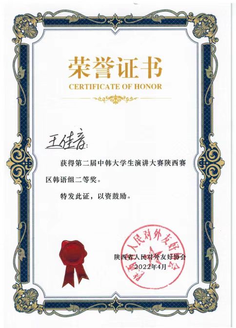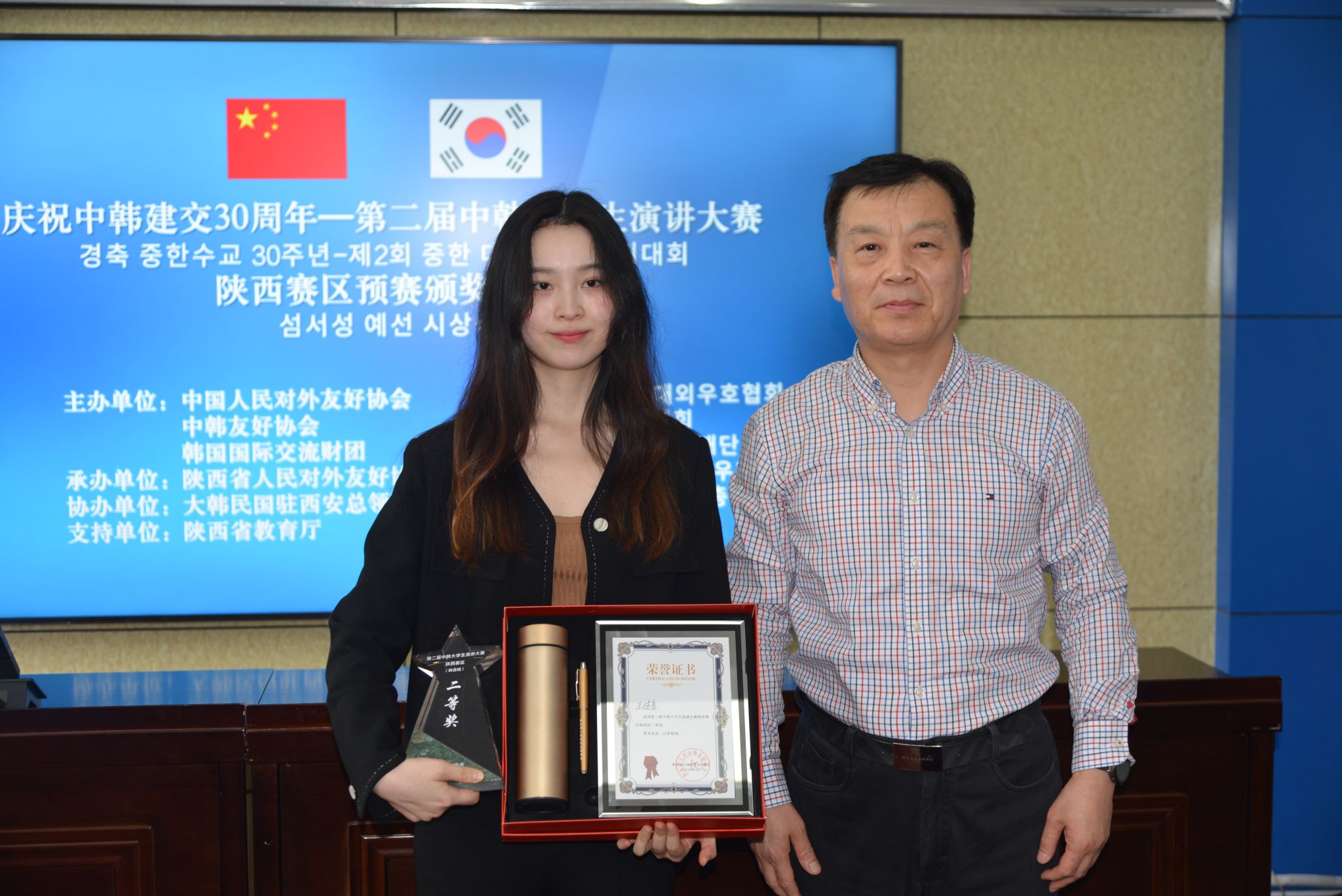 近日,由陕西省人民对外友好协会承办,大韩民国驻西安总领事馆协办,陕西省教育厅为支持单位的第二届中韩大学生演讲大赛陕西赛区预赛在西安成功举办。我校的朝鲜语专业学生王佳音同学获得第二名的佳绩。