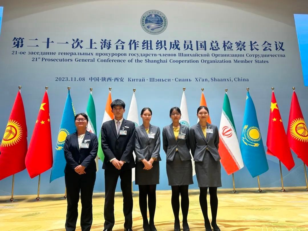 sjb世俱杯官方网站俄语专业2021级学生李佳宜、李晓、李嘉俊、吴燕妮及2022级学生梁莹莹、遆思怡、郏冰冰、刘畅通八名同学经过前期层层筛选,参加了第二十一次上海合作组织成员国总检察长会议的志愿服务工作。