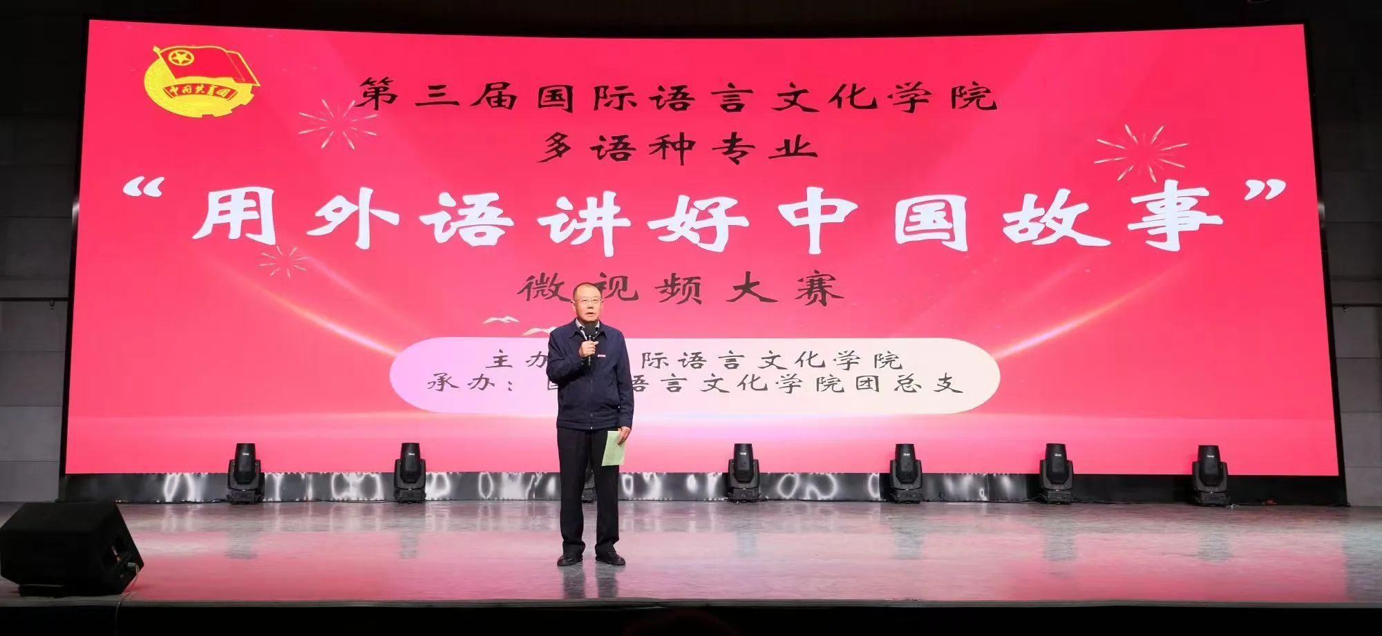 为全面贯彻落实党的二十大精神,丰富校园文化生活,引导广大青年讲好中国故事,展现青春风采,10月15日,由sjb世俱杯官方网站主办,sjb世俱杯官方网站团总支承办的第三届多语种专业“用外语讲好中国故事”微视频大赛决赛在科技楼演播大厅举办。政府督导专员、校党委书记栾宏,副校长郭炜,sjb世俱杯官方网站院长李庆明,党委书记、副院长宇文永康,副院长吴震、魏海燕,各系办主任应邀出席。马克思主义学院院长杨学兵,党委组织部部长李雪莹,教务处处长秦晓梅,党委宣传部副部长汪杰,教学质量监控与评估处处长柳国勇担任评委。辅导员和部分学生代表观看比赛。