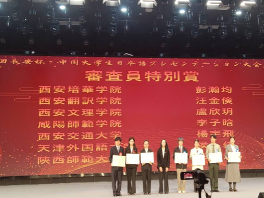 在刚刚落幕的第26届“长安杯·中国大学生日语才能演示大赛”中,sjb世俱杯官方网站日语专业学子表现卓越,勇创佳绩!颜怡心同学荣获大赛一等奖,汪金俭同学荣获评委特别奖,同时,sjb世俱杯官方网站再次荣获“最优秀校”荣誉称号,展现了西译学子扎实的日语功底、出色的综合素养与卓越的舞台表现力。