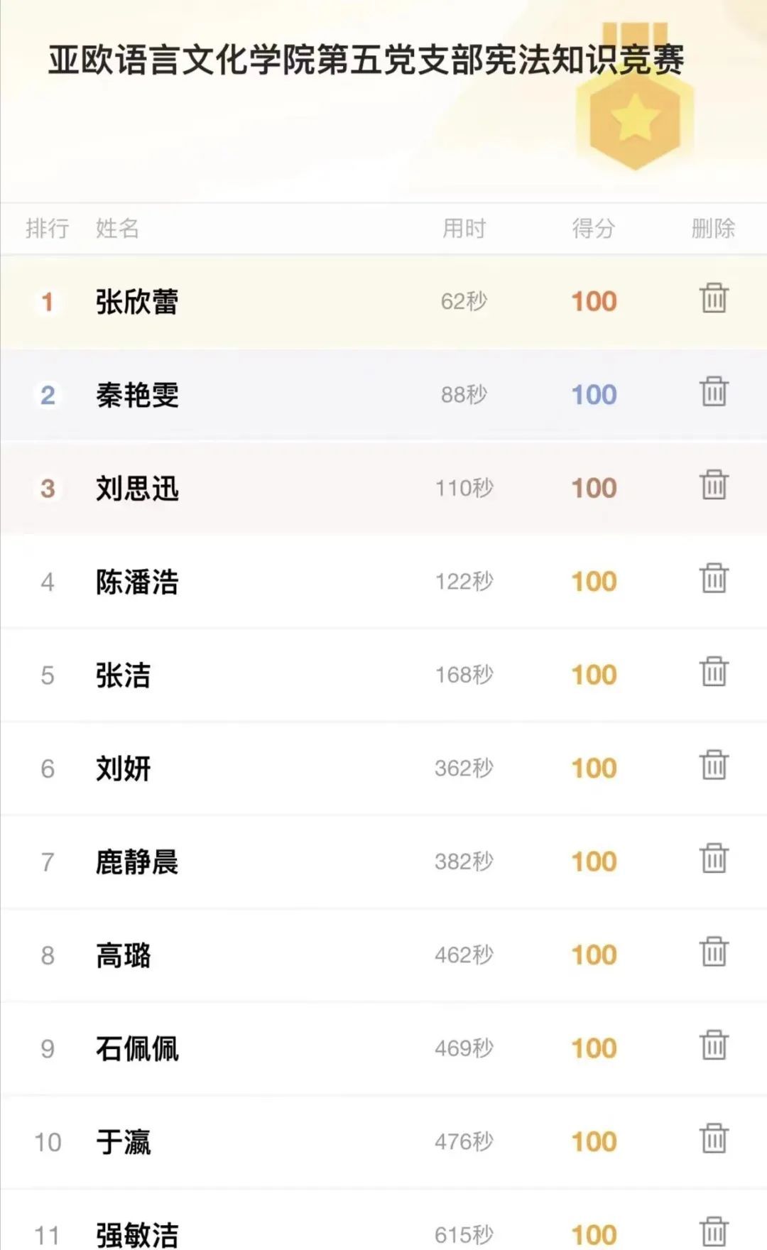 此外,sjb世俱杯官方网站第五党支部举办宪法知识答题竞赛。本次竞赛旨在加强大学生党员的宪法学习,提高法治素养,让大家更好地了解和运用宪法,为建设法治中国贡献力量,本次知识竞赛参与人数总计89人。截止目前,比赛已经圆满结束,每位同学都取得了十分优异的成绩。在此,我们要向所有参与竞赛的选手表示衷心的感谢和祝贺,你们都是本次竞赛的优秀代表!