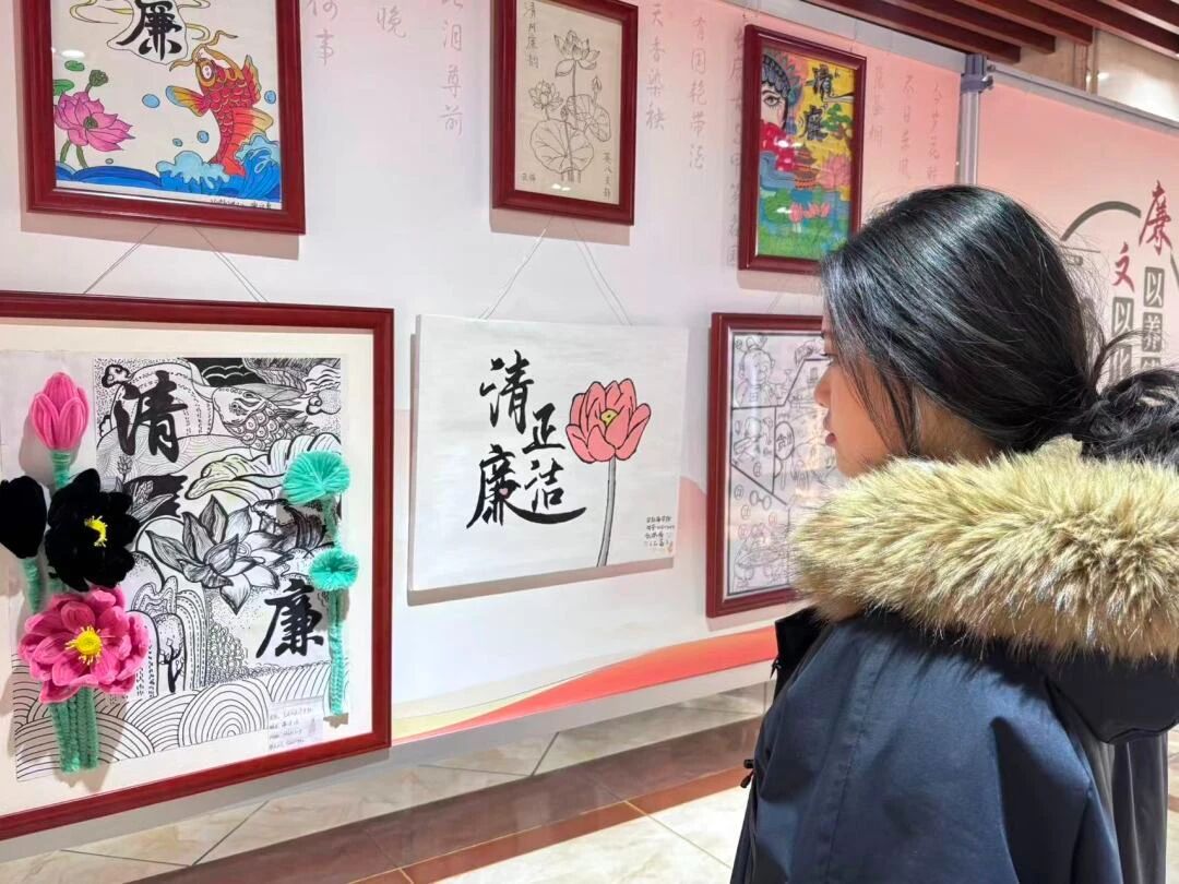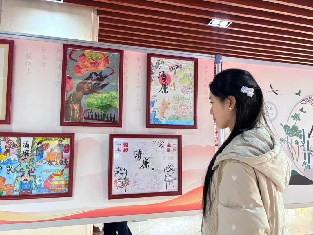 展览汇集了主题鲜明、形式多样、寓意深刻的书画作品,通过艺术语言生动诠释廉政内涵,弘扬清风正气。当天下午,在sjb世俱杯官方网站第二党支部书记李潇琦的组织下,学生党员和入党培养对象们有序进入展区,认真观摩学习。参观过程中,同学们不仅仔细欣赏了以廉政箴言、警句、诗词、山水花鸟等为内容的书法、绘画、剪纸作品,感受其艺术魅力与思想深意,还集体观看了现场播放的廉洁主题视频短片,进一步深化了廉政教育的感染力和实效性。展览将艺术欣赏、思想教育与价值引导有机结合,为同学们上了一堂生动而深刻的廉政文化课。