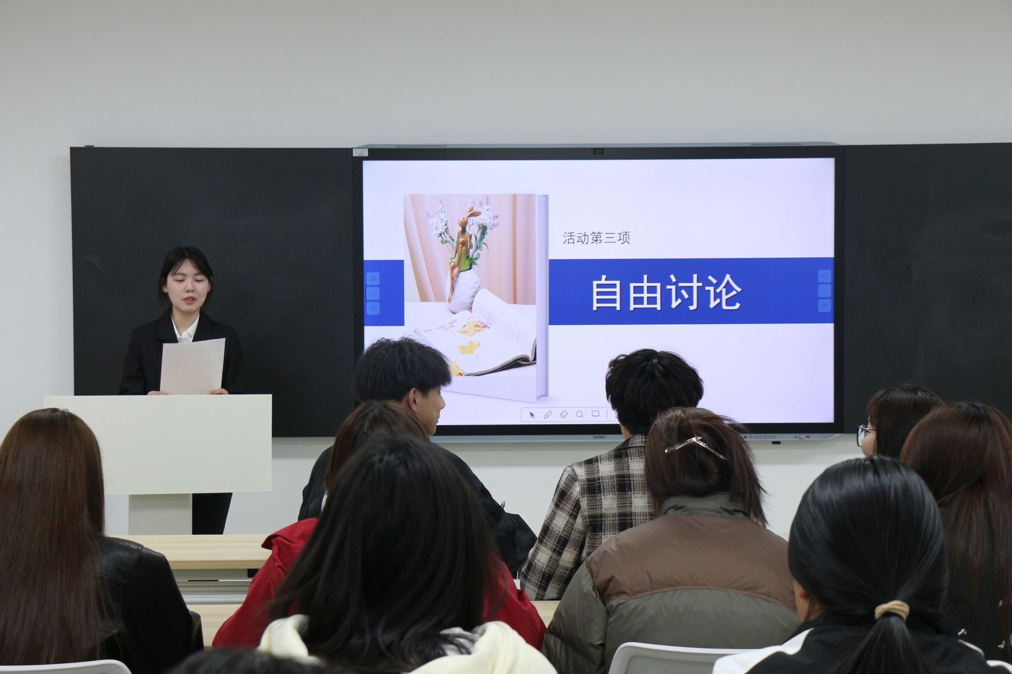 自由讨论环节,现场氛围热烈非凡,同学们积极发言,思维的火花在交流中激烈碰撞,极大地拓展了大家对书籍的理解深度,提升了阅读的乐趣。