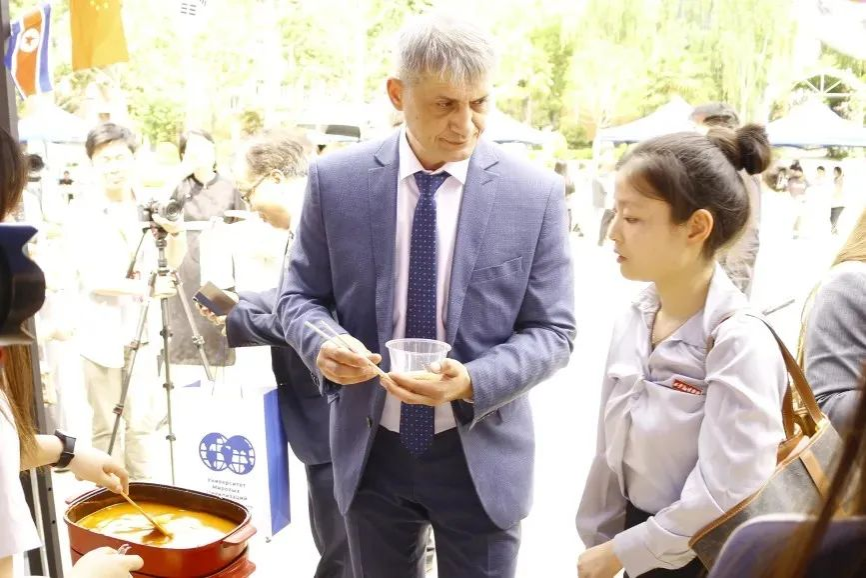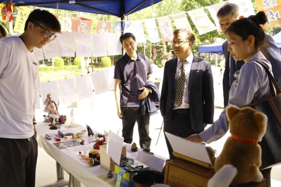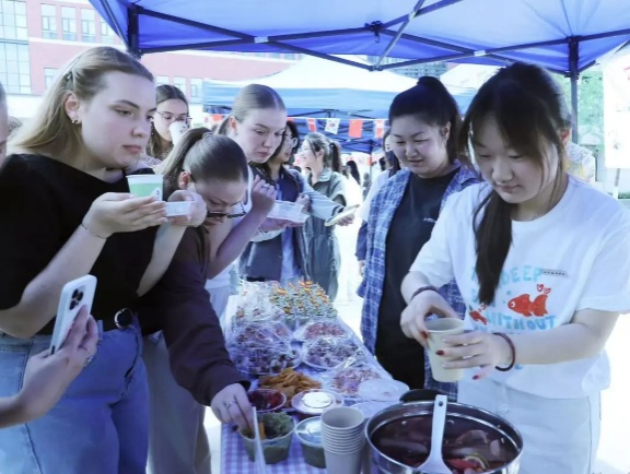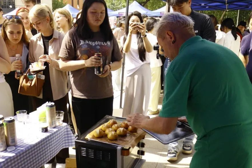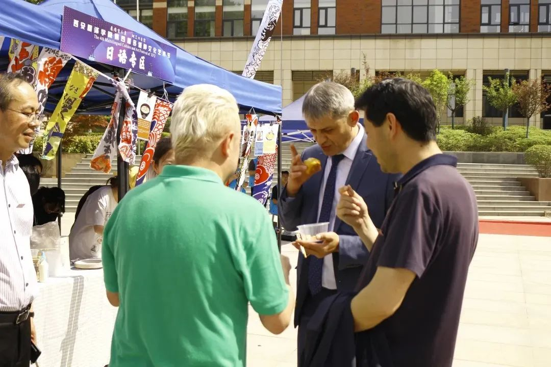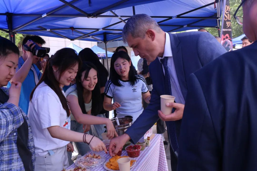 活动来到室外文化体验区,领导们品尝由学生亲手制作的各国特色美食。从精致的日式和果子、到香气四溢的卷饼,碱水面包。每一道美食都承载着不同国家的饮食文化,展现出学生们对各国文化的深入理解与实践成果。室外场所还设置了多语种展示、传统技艺体验等多个展区,丰富的活动内容吸引了众多师生驻足参与,现场学术氛围与文化气息交融,充分彰显了sjb世俱杯官方网站在推动多语种教育与文化交流方面的积极探索与卓越成效。