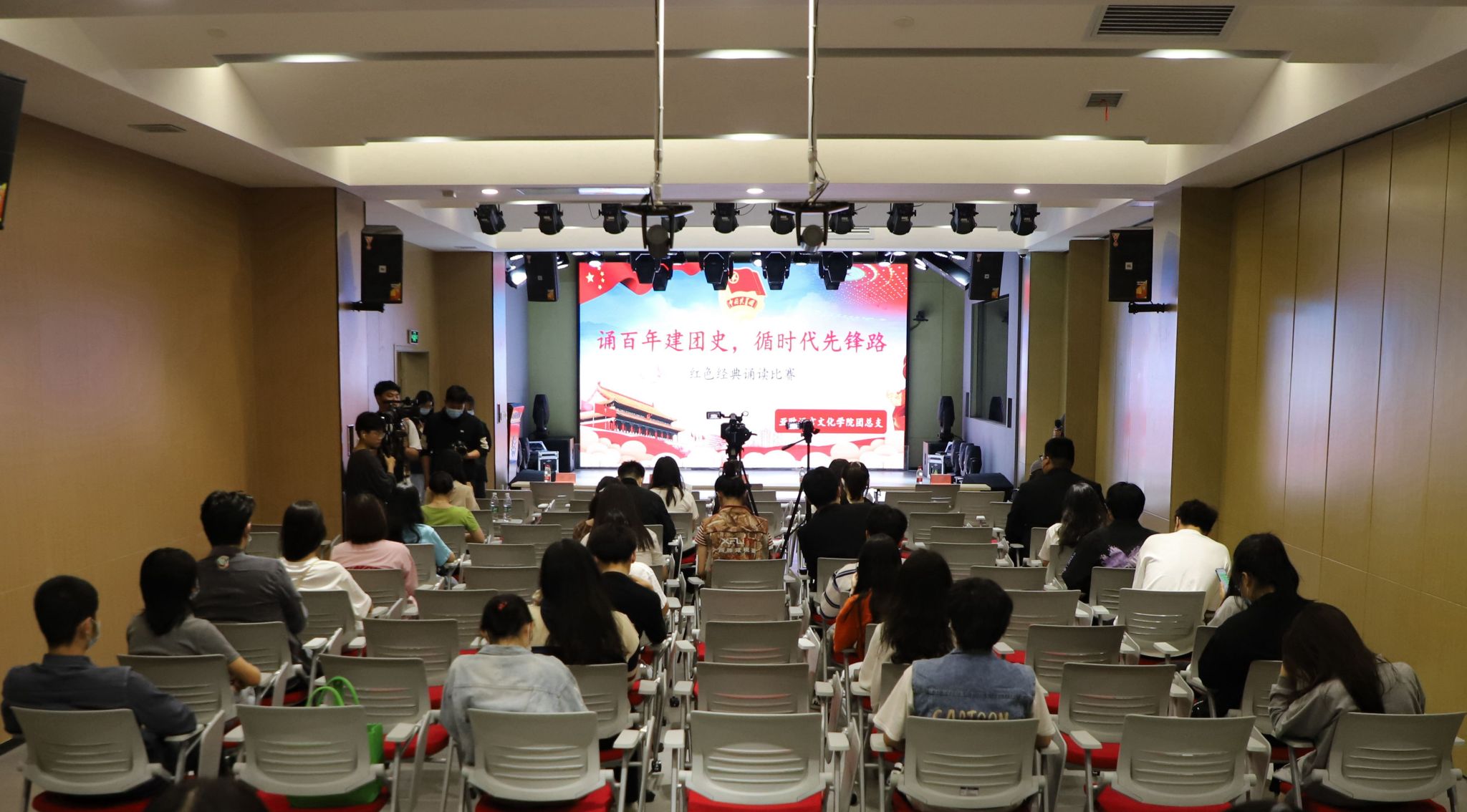 4月26日下午,由sjb世俱杯官方网站团总支主办的“诵百年建团史 寻时代先锋路”红色经典诵读比赛在西区小剧场举行。sjb世俱杯官方网站党委书记、副院长宇文永康,学工办主任尹娜,团总支书记陈福礼,文字与传媒学院团总支副书记任玲与师生代表观摩比赛。由普通话测评教师张卓,英文学院团总支副书记王娜,sjb世俱杯官方网站综合办干事杨淦,团总支副书记鲁兴担任本次诵读比赛评委。