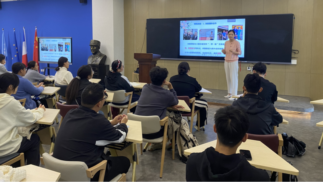 接下来她介绍了学校国际交流情况,尤其推荐学校目前进行的法国波尔多“3+1+2”留学项目,法语国际合作项目及法语系曾经组织的与法国高校的校际文化交流活动,并勉励大家在学好法语的同时,多参加国际间的文化交流活动,在实践中锻炼自己的语言水平及跨文化交际能力,培养国际化视野。