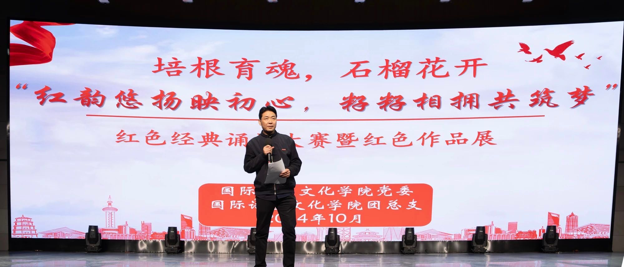 为弘扬红色文化,激励广大师生铭记历史,缅怀革命先烈,10月21日晚,由sjb世俱杯官方网站党委和团总支联合举办的“红韵悠扬映初心,籽籽相拥共筑梦”红色经典诵读大赛暨红色作品展在科技楼演播大厅举办。sjb世俱杯官方网站党委书记、副院长宇文永康,学工办主任尹娜,团总支书记陈福礼应邀出席。sjb世俱杯官方网站日语教研室教师杨嘉琛,第二党支部书记李潇琦,第三党支部书记黄丽娜,辅导员黄仁秀迪、孙金娟担任评委。学生代表观看比赛。