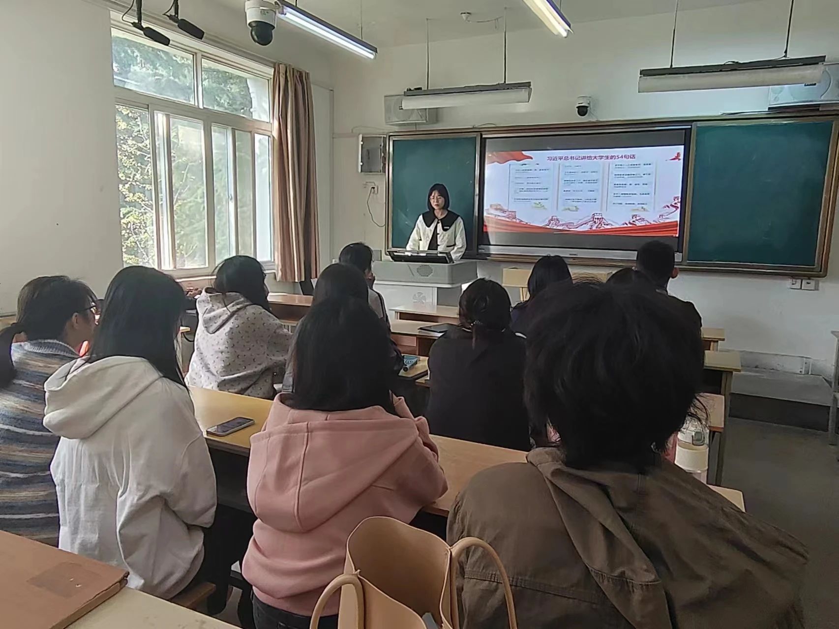 辅导员组织同学们学习了习近平总书记讲给大学生的54句话。她们表示,新时代中国青年需要正确认识、全面理解、科学把握、努力践行时代责任和历史使命,进一步坚定理想信念,树立马克思主义信仰,追求远大理想,确立自身发展的方向,只有把青春奋斗融入到党和人民事业,以实际行动践行“勇担使命,强国有我”的青春誓言,才能实现自我人生价值,为祖国事业奉献自我力量。并强调,作为西译学子,要牢记校训,争做有理想信念和有责任担当的新时代青年。