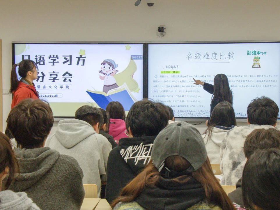 活动伊始,黄丽娜介绍了本次分享会的目的和意义,强调了班级凝聚力的重要性以及学习氛围的营造对于学生个人成长和班级整体发展的积极影响。随后,两位优秀学生代表依次上台进行经验分享,讲述自身学习经验与心得体会。她们鼓励学生们利用在线资源和应用程序来辅助学习,通过听日语歌曲、观看日语电视剧等方式提高日语听力和口语能力。同时,其着重讲述了学习方法的重要性,强调了实际的交流是检验学习成果的最好方式,也是提升语言运用能力的有效途径,激励学生找到适合自己的学习方法,从而达到事半功倍的效果。