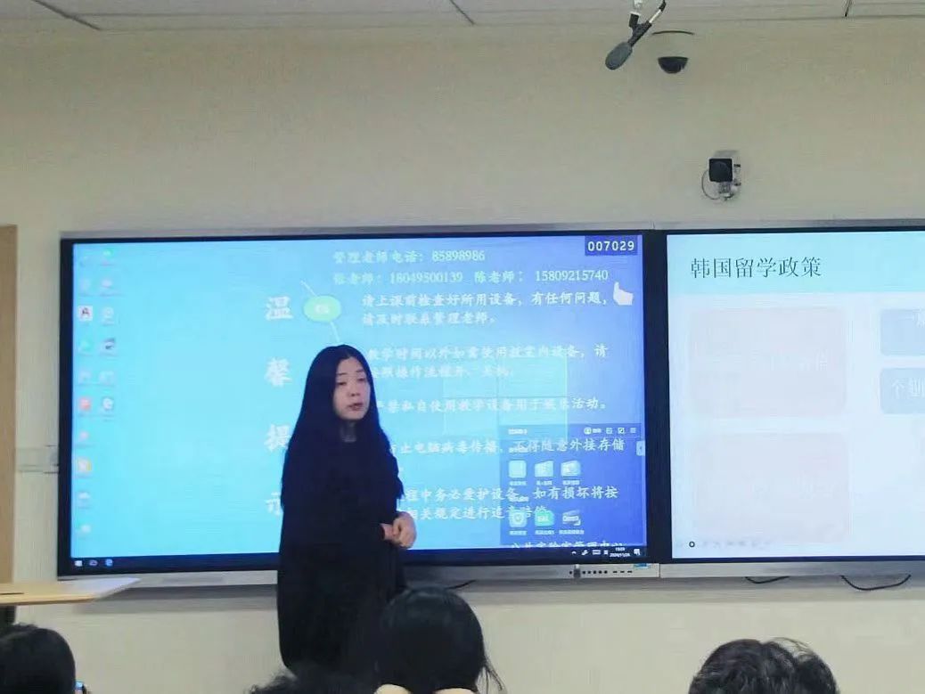 接着,李艳老师介绍了韩国的留学政策。她提到赴韩留学深造,最重要的就是语言能力,并且就提升语言能力的方法展开了详细的讲解。然后,她又说明了韩国高校的招生和奖学金政策,为有意向赴韩留学的学生提供了参考。相信通过这次分享,一年级的新生们都能从中获得启示,提升自我认知和自信,实现自己的留学梦想。