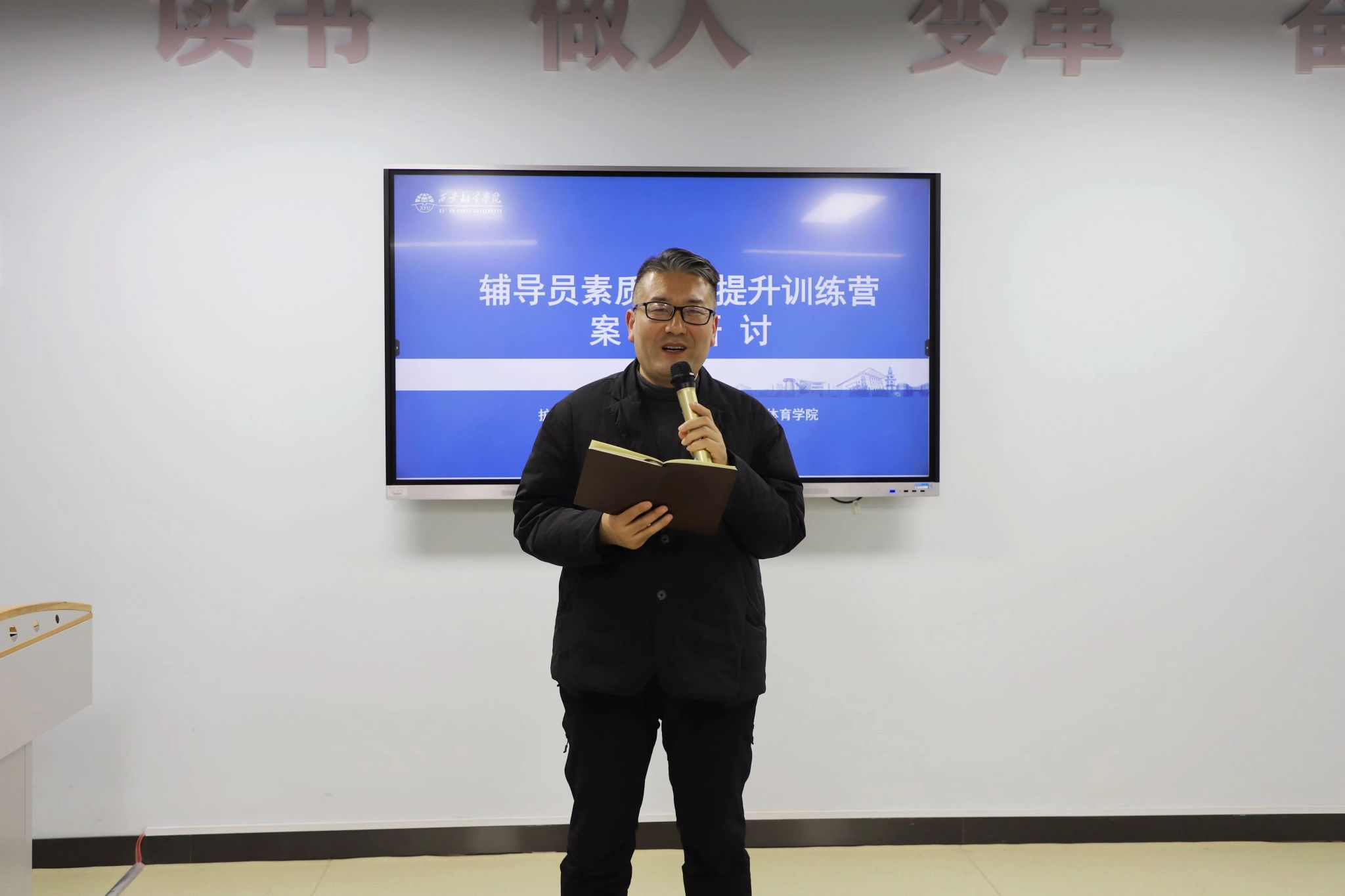 最后环节,樊磊领誓,全体人员高举右拳,庄严地宣誓了《高校辅导员誓词》,用铿锵有力的声音表明自己育人的初心、决心和信心。