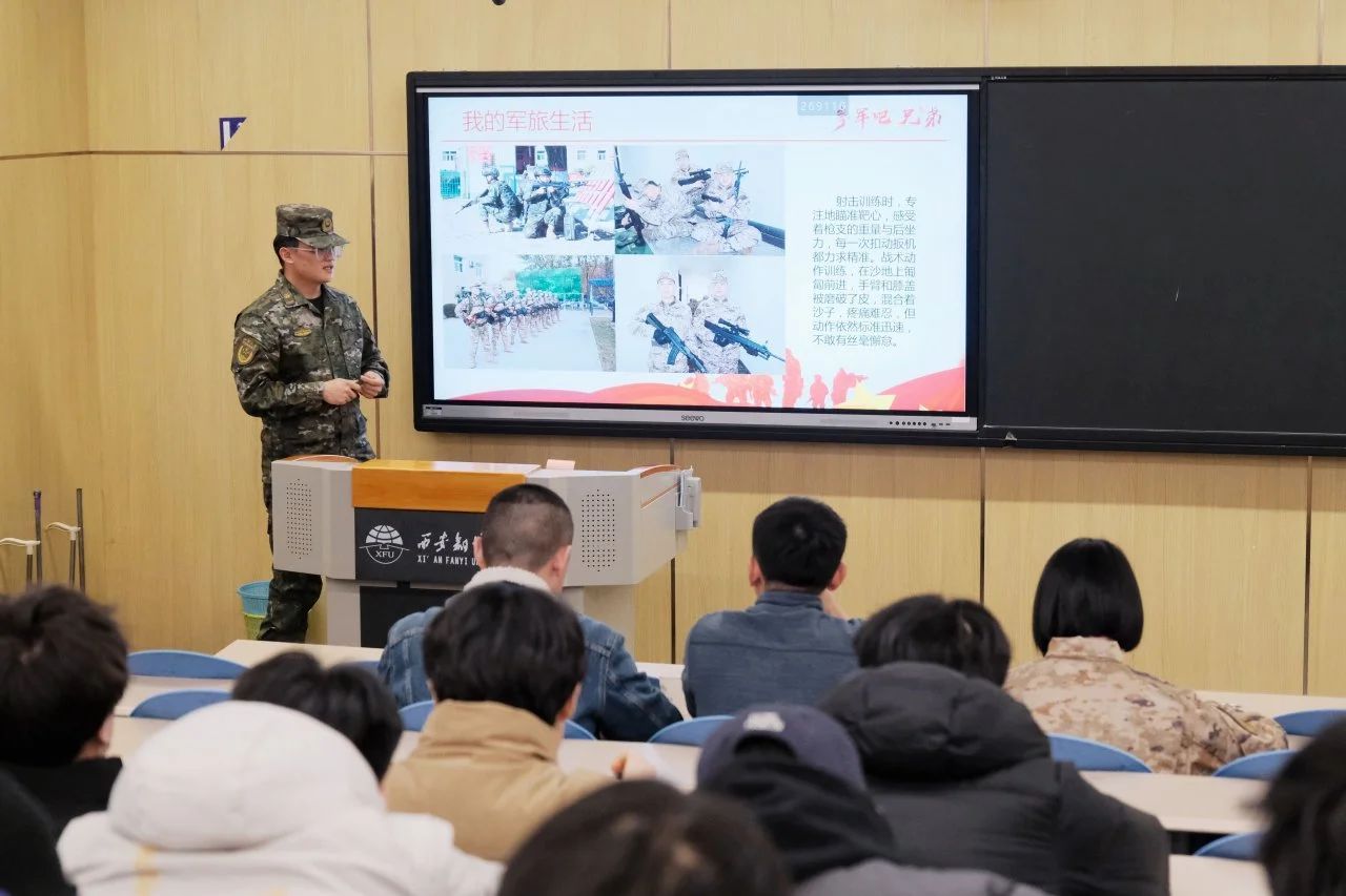 白磊磊以自身军旅生涯为例,详细讲述了从一名普通大学生到合格军人的转变过程。他强调了军旅生活在塑造坚韧不拔精神方面的重要性,指出这种精神将助力学生在未来面对挑战时更加坚定。荣博通过一部精心剪辑的视频,捕捉了军营中那些充满激情与汗水的瞬间,以及执行任务时的紧张与刺激,极大地点燃了同学们的参军梦想。杨雨茜展示了其所在的信息化部队。她介绍到这支部队肩负着保障通信网络畅通的重任,确保前线指挥部能够及时准确地掌握信息,让同学们深刻理解到军队中那些默默无闻却至关重要的贡献者。
