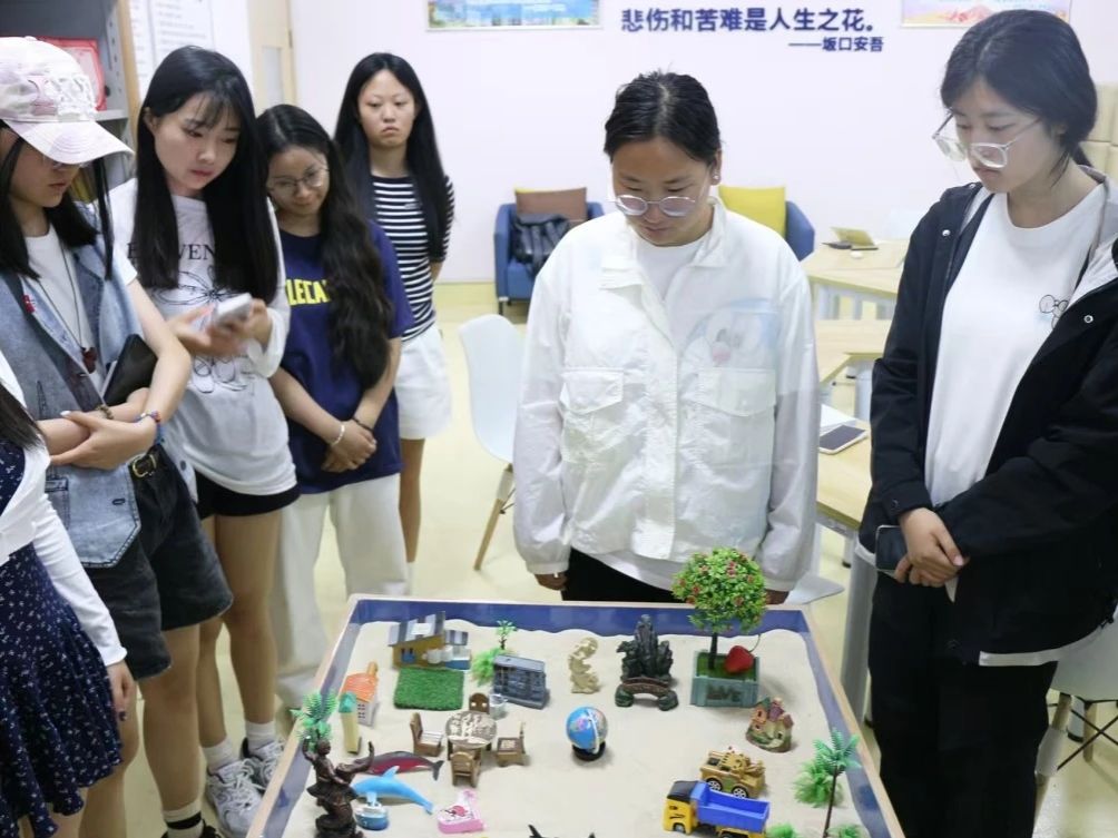 在随后的沙盘体验环节,12名同学以接龙方式共同创作沙盘作品。大家依次选取沙具或塑造沙型,最终完成了包含牧场、嫦娥雕塑、热带树林等元素的“沙滩俱乐部”。这一“团体沙盘体验”帮助同学们在互动中认识自我、缓解压力,同时学习团队协作与情绪表达的技巧。