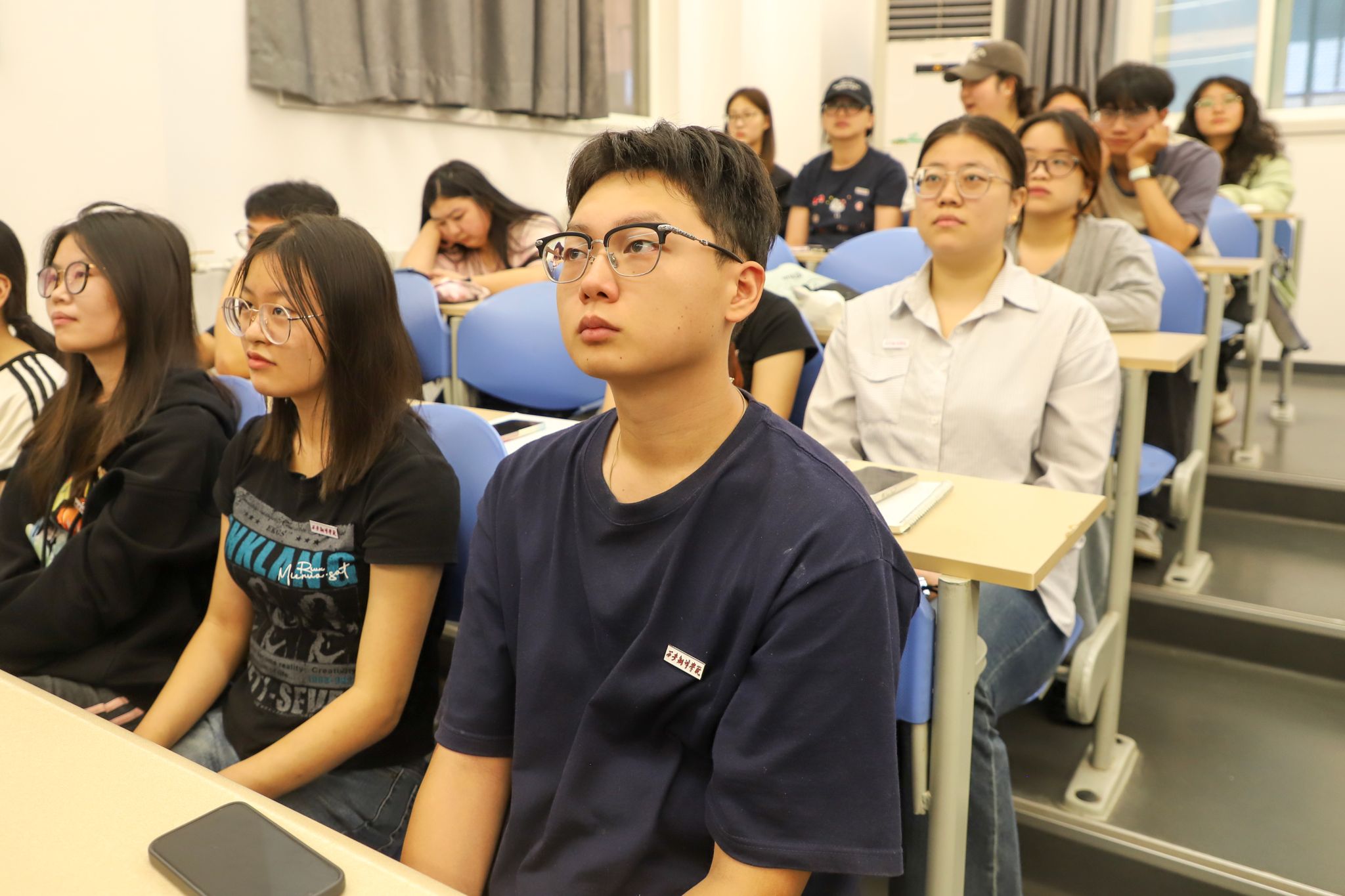 观看过程中,师生们全神贯注,保持庄严肃穆,一次次被阅兵现场的盛大场面所震撼。军人们整齐的迈步、精良的武器装备展示引来了师生们的阵阵惊叹和掌声。