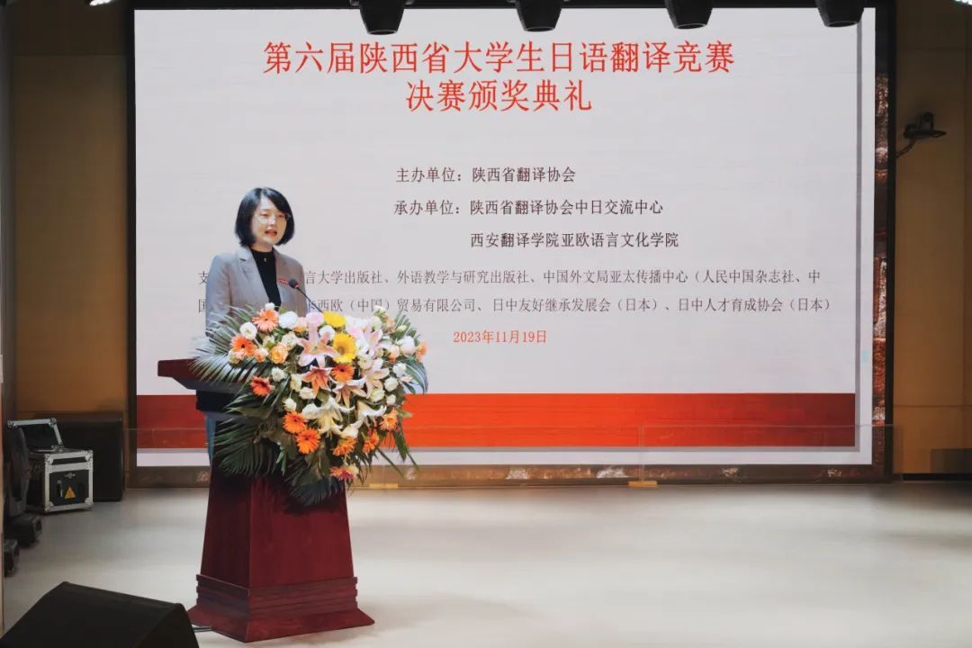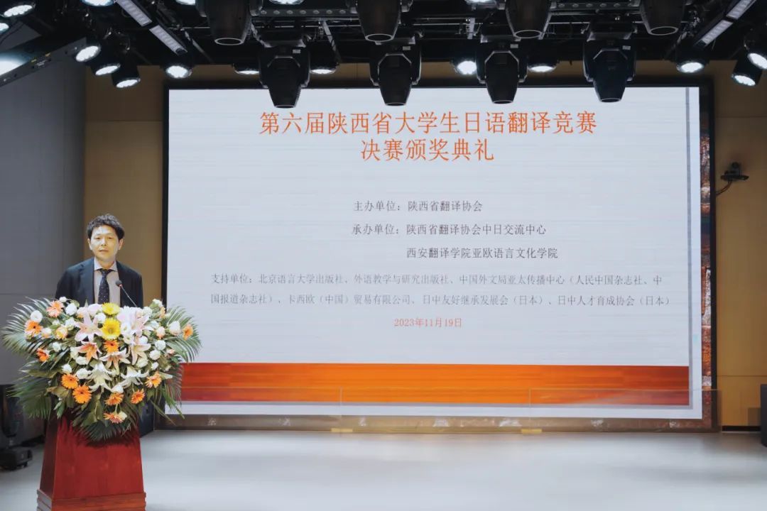 陕西省翻译协会会长胡宗锋在致辞中表示,陕西省大学生日语翻译竞赛自2016年举办以来,受到社会各界的广泛关注。此次大赛历时6个月,初赛参赛358人,决赛入围36人。通过此项大赛的举办,相信一定能够起到提高我省大学生日语翻译水平、增强各院校间相互交流、促进中日交流事业发展的良好作用,期待陕西省翻译协会与中日交流中心的各项事业蓬勃发展,为“一带一路”建设、为中日友好交流再立新功。