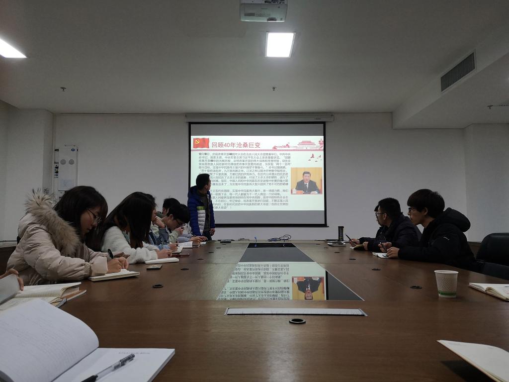 12月24日,万象城娱乐awc线路硕8018+8020班党支部在仲英第二会议室召开党日活动。会议由支部书记王普强、张高同志、支部委员朱波、李臻同志共同主持,支部共15人参加。本次会议特别邀请了孙巧艳教授与会指导。会议的主题为“纪念改革开放四十周年”。